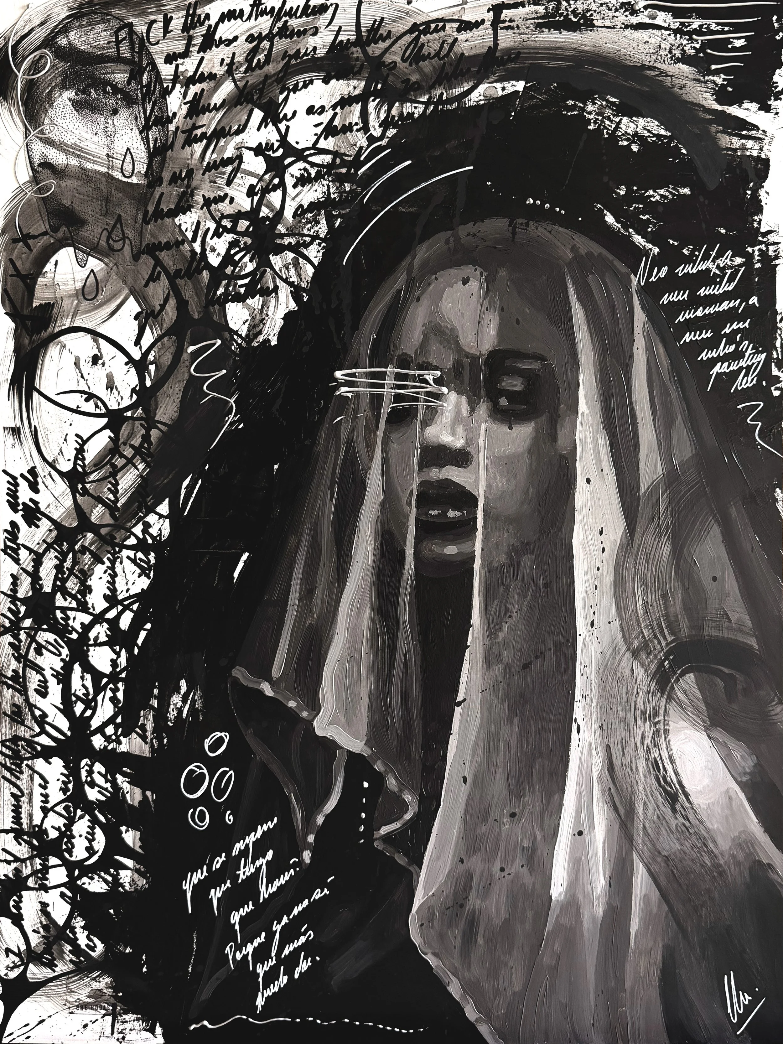 A veiled figure emerges through layered mark-making, handwritten fragments, and gestural interference. The surface becomes unstable: thoughts interrupt form, and visibility is partially obscured, partially constructed.